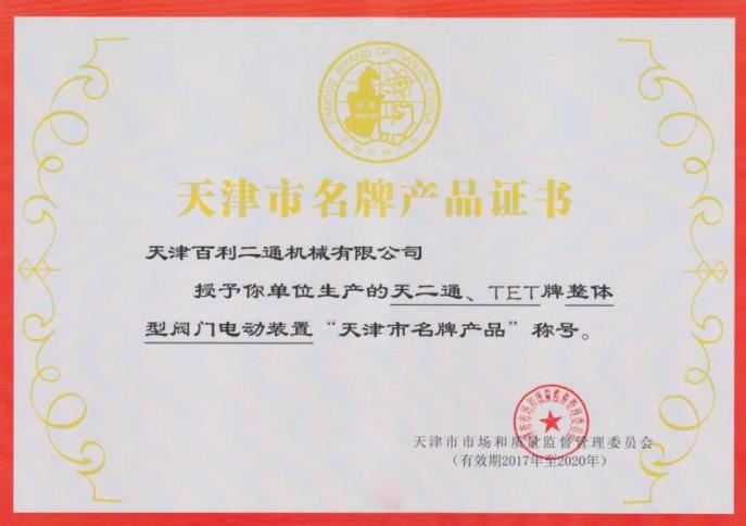 整體型閥門(mén)電動(dòng)裝置名牌產(chǎn)品證書(shū)