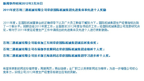 百利二通機械有限公司先進集體和先進個人表彰