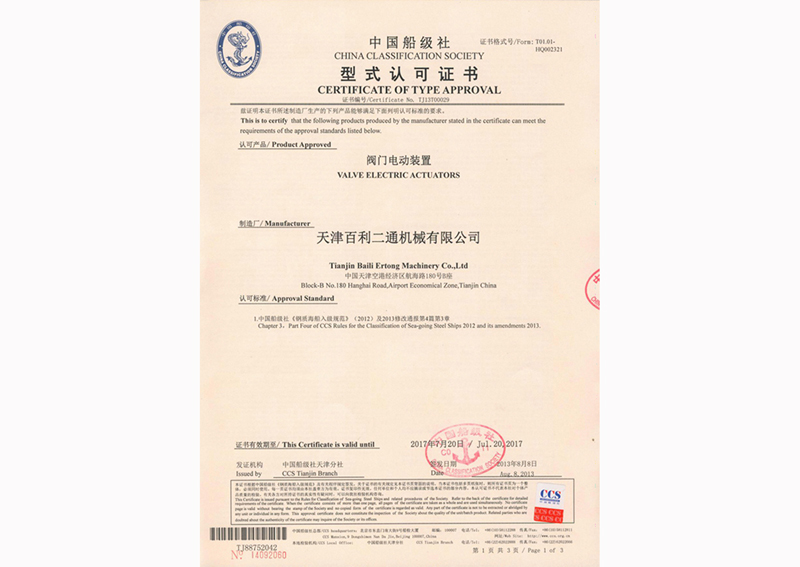 天津百利二通機(jī)械有限公司作為國內(nèi)首家,也是國內(nèi)唯一獲得中國船級(jí)社CCS國際航行船舶范圍閥門電動(dòng)裝置產(chǎn)品型式認(rèn)可證書單位。2013年8月8日,公司順利通過2009年型式認(rèn)可證書到期換證工作。